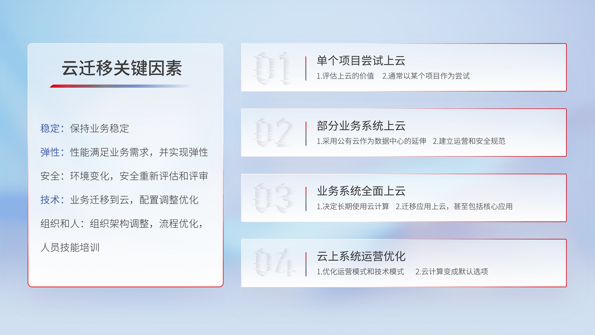 结合实际业务,,从规划设计、、云平台选型、、、云原生改造、、、数据迁移、、、、集成交付,,迁移全过程为客户识别最佳上云路径,,,,做好风险识别管理,,,,设计网络架构、、、身份权限、、、安全审计合规、、、操作审计、、、、日志审计、、监控告警策略、、、多站点容灾设计等,,,,对云上基础设施进行整体规划,,提升IT治理水平,,,,以满足弹性、、高可用、、、高性能的需求。。。。